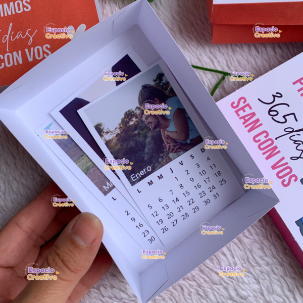 La caja se arma con una hoja A4 y el calendario con 2 hojas.