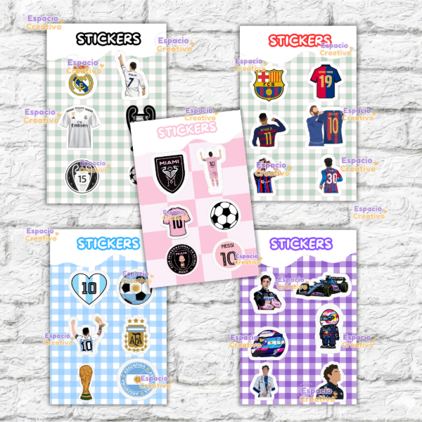 -Incluye 5 diseños: Barcelona, Argentina, Colapinto, Inter de Miami, Real Madrid (cada plancha incluye 6 stickers)